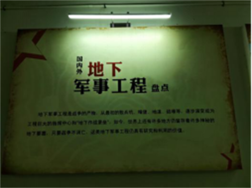 地下室有4,000平米的坑道,悠长阴暗,深不见底,是林彪的军事秘密基地,坑道两侧图片记录展示部分国内外地下军事工程