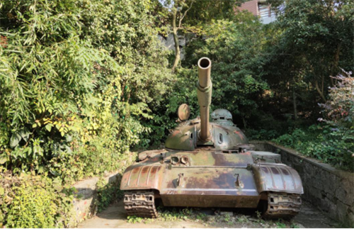 在地下坑道入口左侧边上还有一辆废弃坦克,据称这是当年斯大林送给林彪的生日礼物,爬到坦克上方还可以清晰看到坦克内部的结构。
