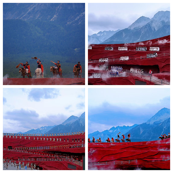 《印象丽江》是张艺谋导演的“印象系列”之一,虽然全程不太能听懂,但确实是一场灵魂与视觉的盛宴。全剧共分古道马帮、对酒雪山、天上人间、打跳组歌、鼓舞祭天和祈福仪式6个部分演出以玉龙雪山为背景,搭建的红色建筑为舞台,融入民族文化风情,以当地农民做演员,在海拔3100米的玉龙雪山甘海子蓝月谷露天剧场,真马、真景、真情的表演,整个演出可谓是震撼人心!