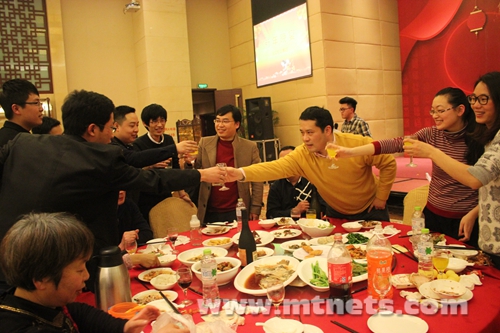 20多个节目在小伙伴们的掌声中如火如荼的进行着。大家一边吃着水果,一边观看节目,在笑声欢语中,年会晚宴也随之开始。董事长陈胜明与执行总裁方国强亲自走到每位员工的餐桌前,与大家一同举杯共庆新春佳节的到来。