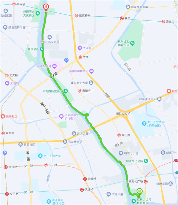 本次活动线路是沿着运河游步道西湖文化广场走到运河文化广场拱宸桥下全长约5.5公里,全程用时约1小时20分钟。