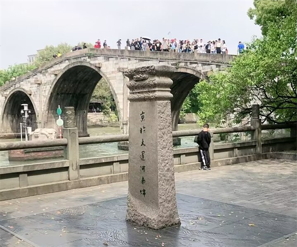 京杭大运河最南端位于杭州拱宸桥,并在桥边立碑,该桥是一座三孔的拱桥,初建于明崇祯四年(1631年),已有三百多年的历史。现存桥为清康熙时重建,全长138米,宽6.6米。石砌桥墩逐层收分,桥面两侧作石质霸王靠,气势雄伟,下面各有两个防撞墩,防止运输船只撞到桥墩。该桥位于杭州市运河文化广场,它坐落在杭州市拱墅区桥弄街,横跨于古运河之上,是杭州古运河终点的标志。