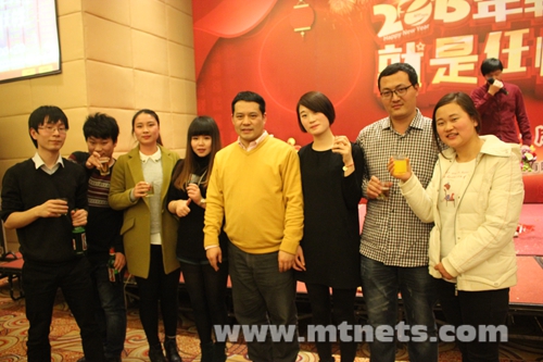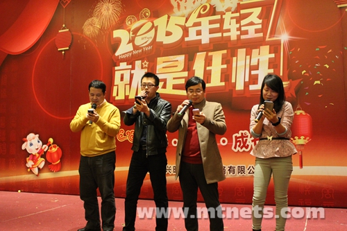 20多个节目在小伙伴们的掌声中如火如荼的进行着。大家一边吃着水果,一边观看节目,在笑声欢语中,年会晚宴也随之开始。董事长陈胜明与执行总裁方国强亲自走到每位员工的餐桌前,与大家一同举杯共庆新春佳节的到来。